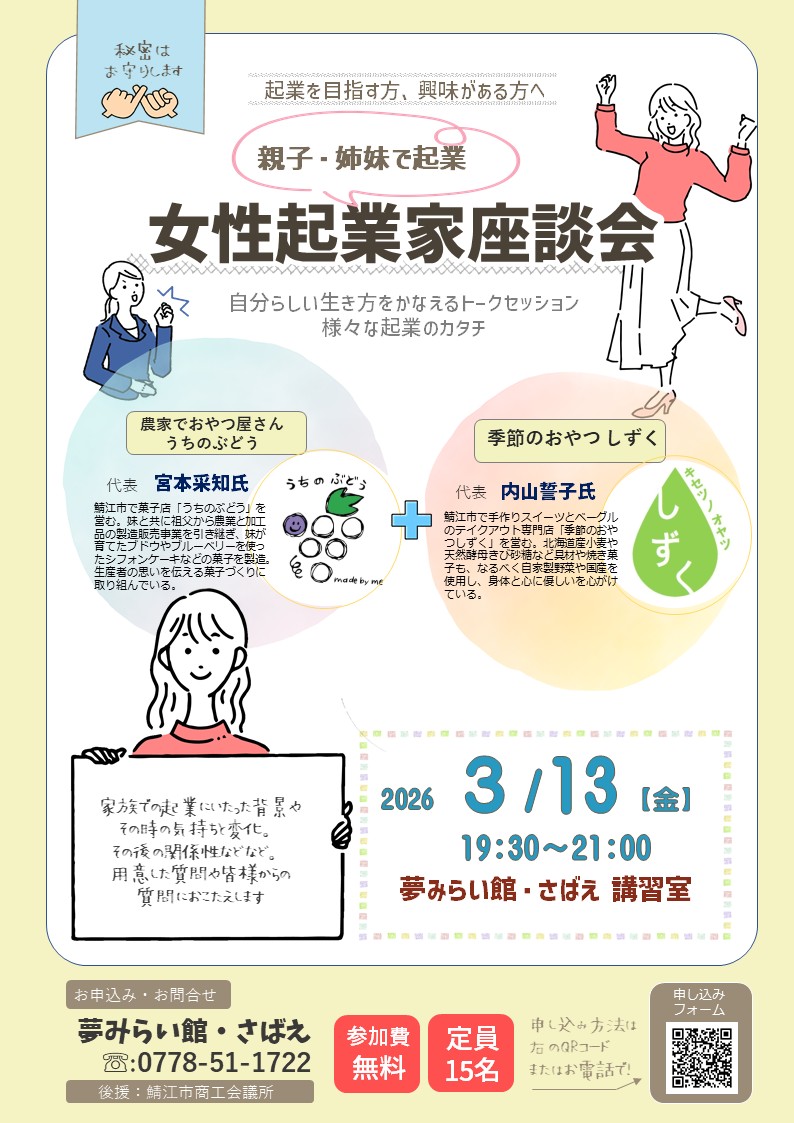 親子・姉妹で起業している女性起業家を囲んで、座談会を開催します。
